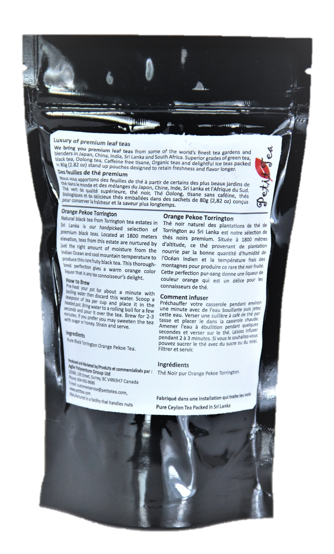 Natural black tea from Torrington tea estates in Sri Lanka is our handpicked selection of premium black teas. Located at 1800 meters (6000 ft.)elevation, teas from this estate are nurtured by just the right amount of moisture from the Indian Ocean and cool mountain temperature to produce this rare fruity black tea. This thoroughbred perfection gives a warm orange color liquor that is any tea connoisseur’s delight.